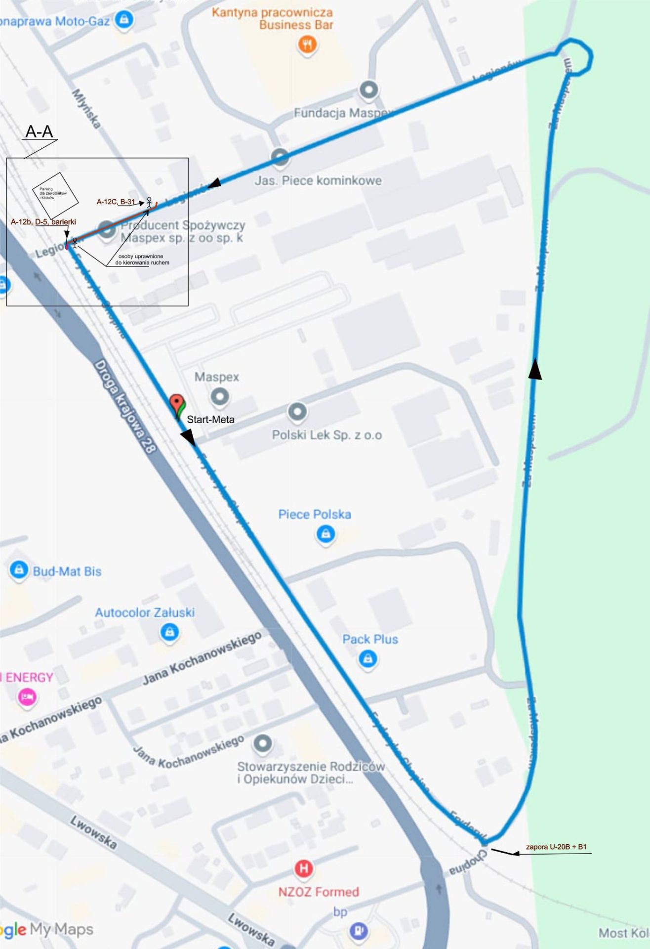 Trasa przejazdu przebiega wokół firmy Maspex po drodze asfaltowej.